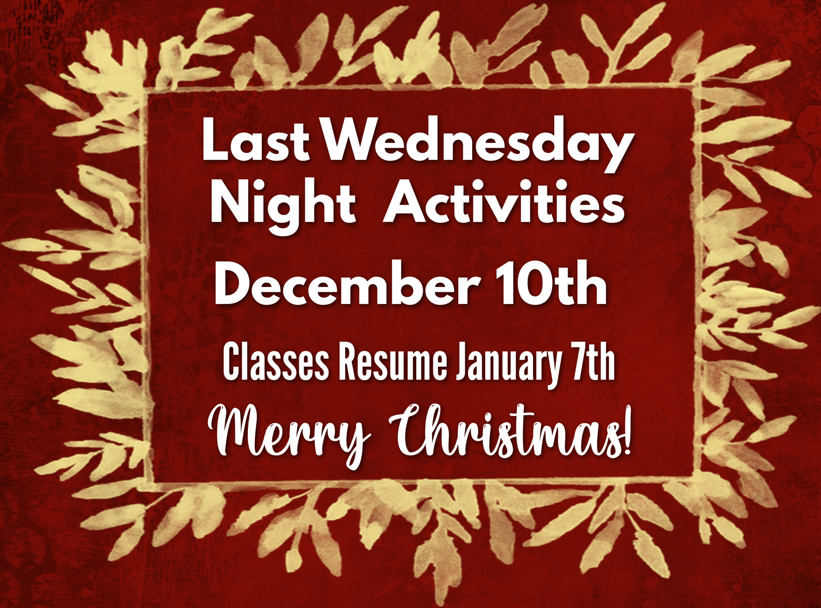 Please join us for our Wednesday Night Activities from 6:30-8:00 pm. We offer something for all ages. Cubbies (Pre-K), Emmanuel Kids (K-3rd grade), Club45 (4th-5th grade), Luminate Youth Group (6th-12th grade), and Adult classes (Pastor Sean, Terrina Hill & Christina Giordano). This is our last night for Wednesday Night Activities for the year. All classes resume on January 7th.